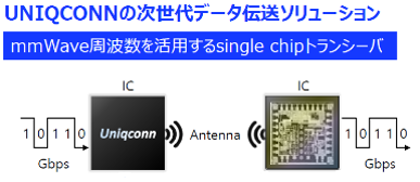 Uniqconn製チップは60GHz帯(ミリ波)を使用したした大容量・高速無線通信が可能です。
